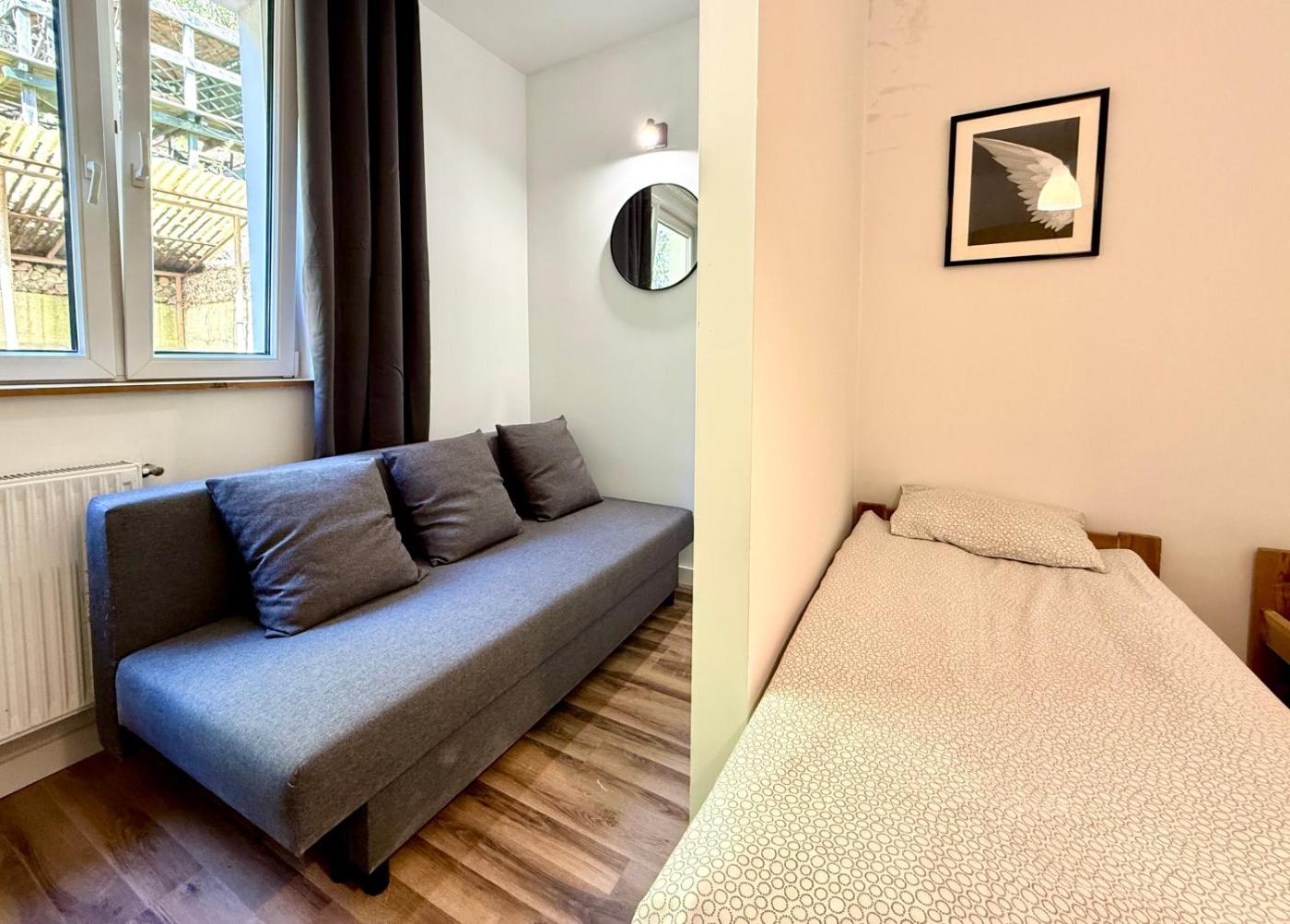 Studio. The studio provides a washing machine, a dining area, as well as a private bathroom featuring a shower. Guests can make meals in the kitchenette that is equipped with a stovetop, a refrigerator, kitchenware and an electric kettle. The studio features a wardrobe, parquet floors and heating. The unit offers 2 beds. Studio - 2 osobowy. Powierzchnia pokoju ok.: 20 mkw. ;